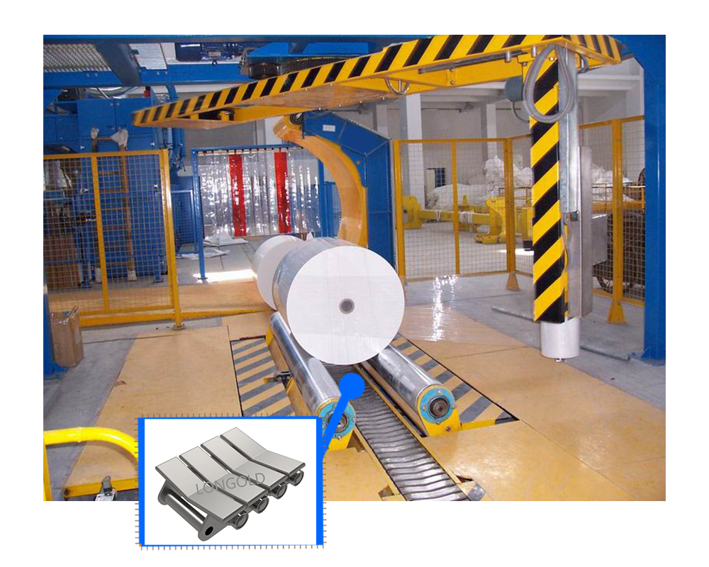 紙卷用輸送鏈帶頂置特殊V型附板,由一系列的鏈節(jié)組成??梢栽谲壍郎蠞L動(dòng),從而帶動(dòng)卷紙向前移動(dòng)。軌道是卷紙輸送鏈的支撐部件,它可以為滾輪提供支撐和導(dǎo)向。驅(qū)動(dòng)裝置是卷紙輸送鏈的動(dòng)力部件,它可以為卷紙輸送鏈提供動(dòng)力,使其運(yùn)行。