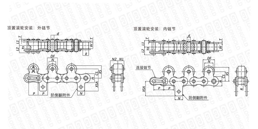 在內(nèi)鏈節(jié)或者外鏈節(jié)上加裝防側(cè)翻附件。