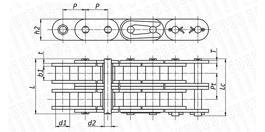 上圖為雙排不銹鋼短節(jié)距A系列滾子鏈本體的結(jié)構(gòu)圖。