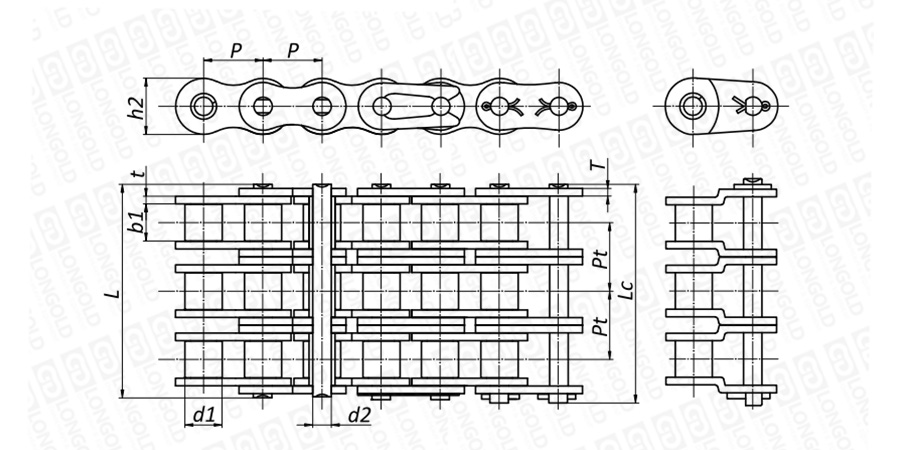 上圖為三排不銹鋼短節(jié)距B系列滾子鏈本體的結(jié)構(gòu)圖。