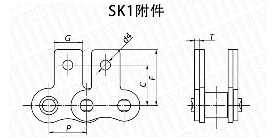 上圖為不銹鋼滾子鏈帶SK1附件的結(jié)構(gòu)圖。