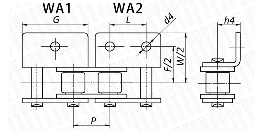 上圖為不銹鋼滾子鏈帶WA1和WA2附件的結(jié)構(gòu)圖。