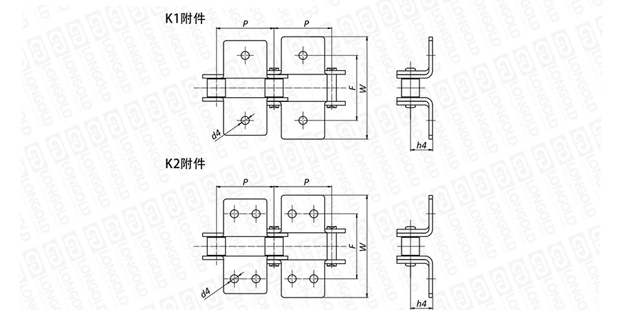 鏈條兩側(cè)帶折彎板附件,附板上帶有1個(gè)或2個(gè)螺孔,附件表示為:K1、K2。