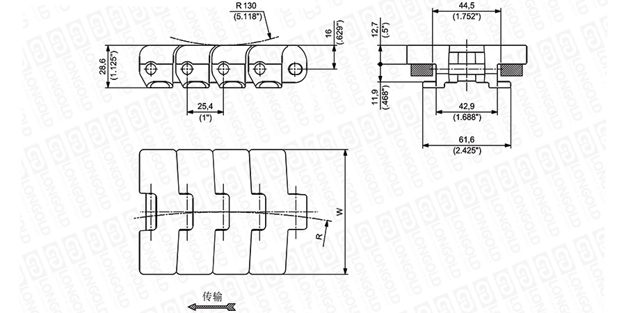 上圖為1"節(jié)距轉(zhuǎn)彎鏈板 793T系列的結(jié)構(gòu)圖,圖紙已標(biāo)明本體尺寸。