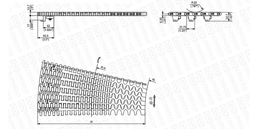 上圖為1 1/4"節(jié)距重載轉(zhuǎn)彎網(wǎng)帶 2556 HTB系列,圖紙中已標(biāo)明部分尺寸。