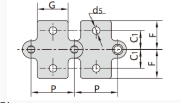 上圖為S滾子鏈雙倍節(jié)距鏈帶附件圖,R滾子型的附件尺寸也與其相同。
