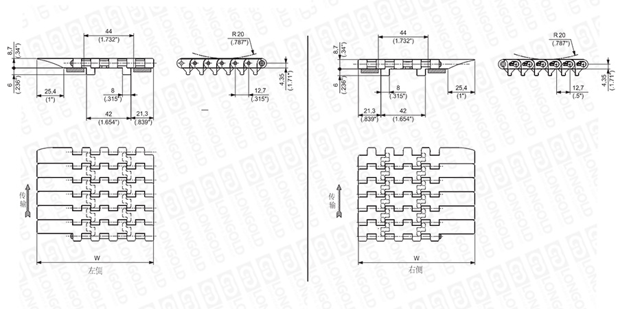上圖為1/2"節(jié)距鏈板 600G ATM系列,圖紙中已標明部分尺寸。