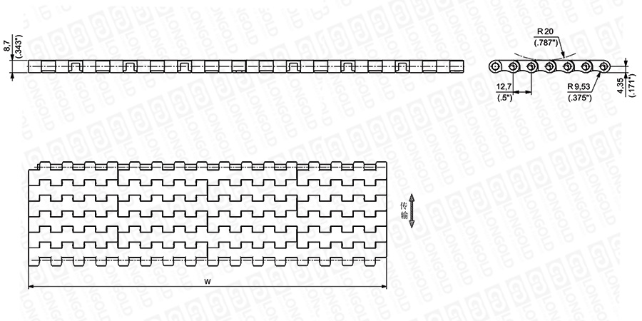 上圖為1/2"節(jié)距網(wǎng)帶與鏈板 300系列的結(jié)構(gòu)圖,圖紙中已標明部分尺寸。
