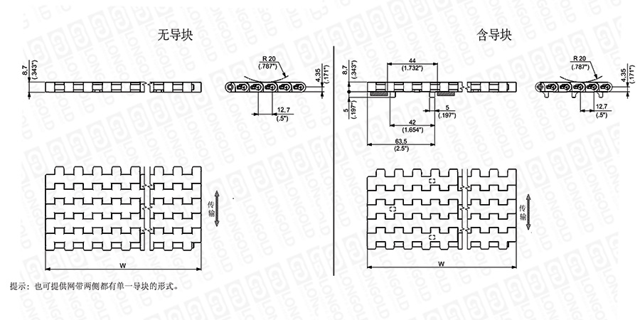 上圖為1/2"節(jié)距網(wǎng)帶與鏈板 600系列的結(jié)構(gòu)圖,圖紙中已標(biāo)明部分尺寸。
