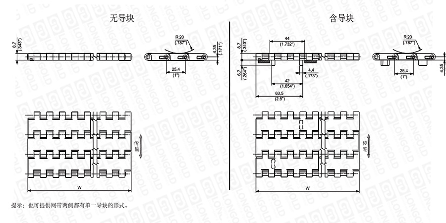 1.網(wǎng)帶寬度:85 mm (3.346")或以85 mm (3.346")遞增
