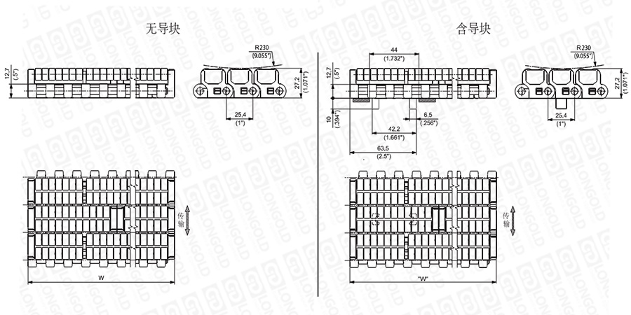 上圖為1"節(jié)距重載網(wǎng)帶與鏈板 LBP USPM系列系列,圖紙中已標(biāo)明部分尺寸。