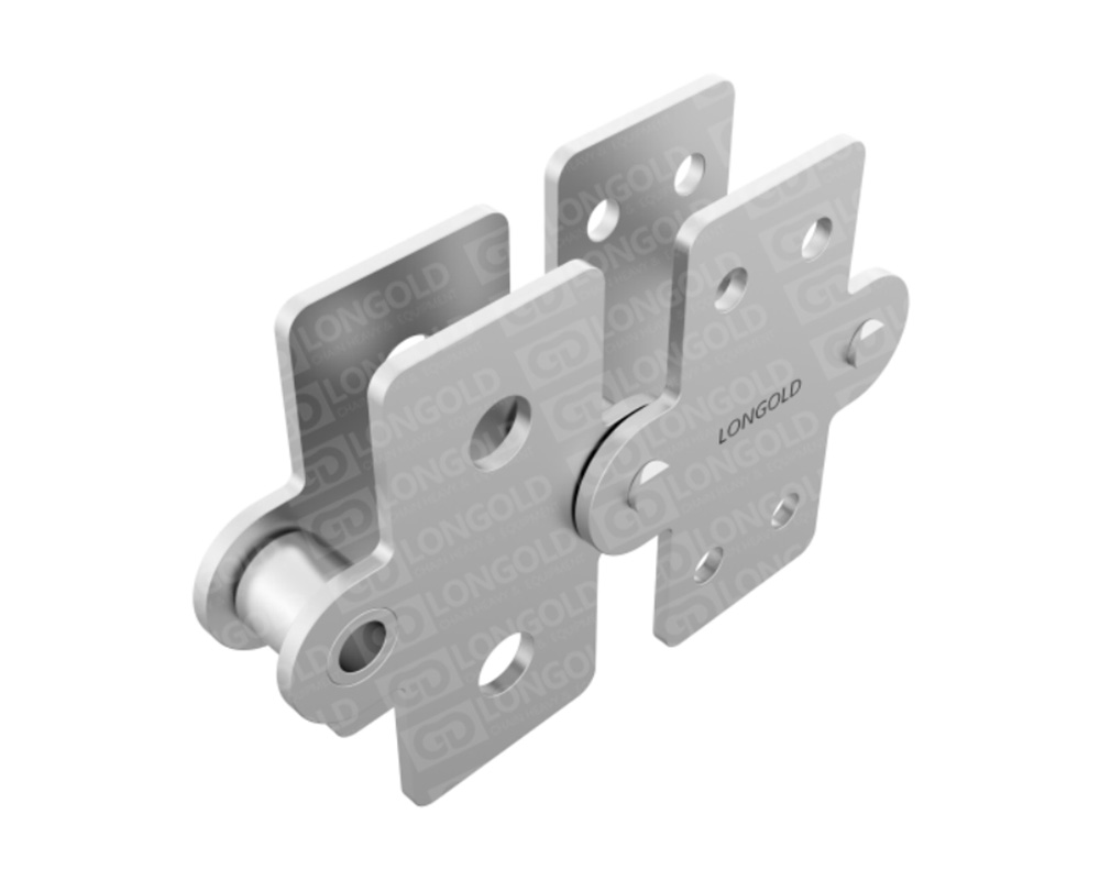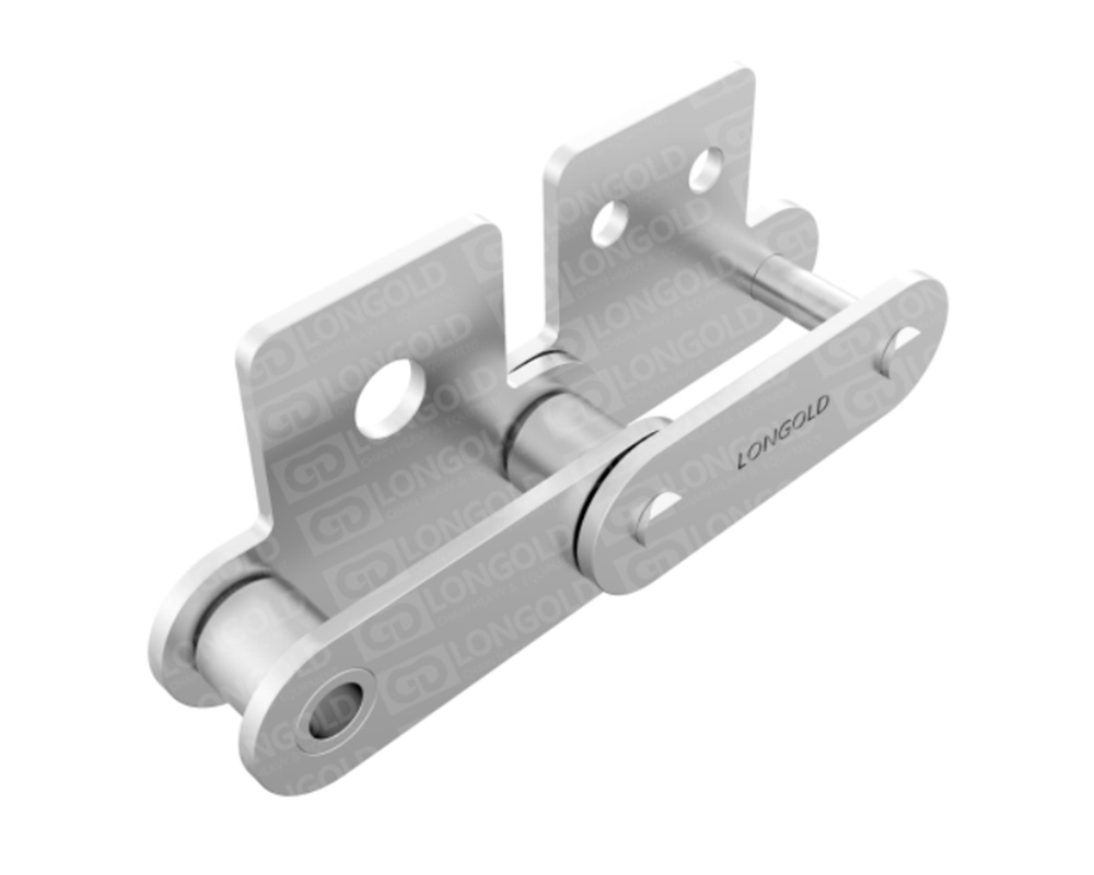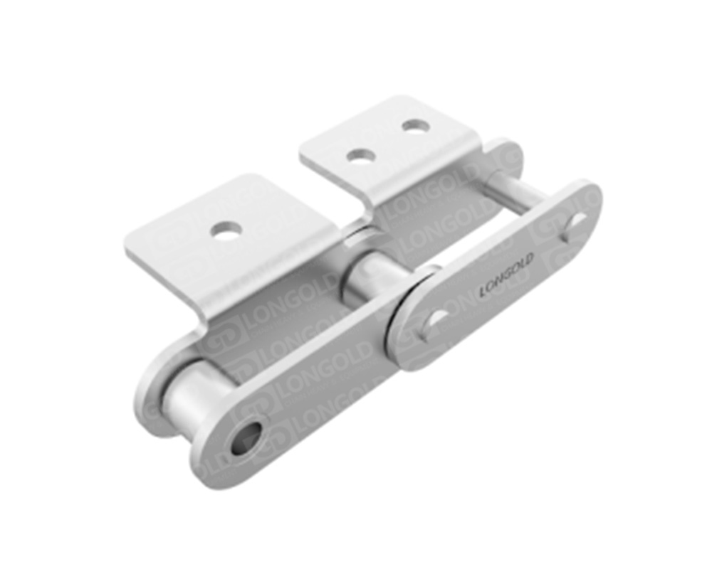 鏈條節(jié)距為標準傳動用滾子鏈的2倍,適用于長距離的物料輸送。不銹鋼鏈條具有良好的耐腐蝕性能??墒褂脺囟葏^(qū)域從-20°C到400°C。鏈條單側鏈板上下延伸,延伸的附板成為附件,附板上帶1個或2個螺孔,附件表示為:SAA1、SAA2。