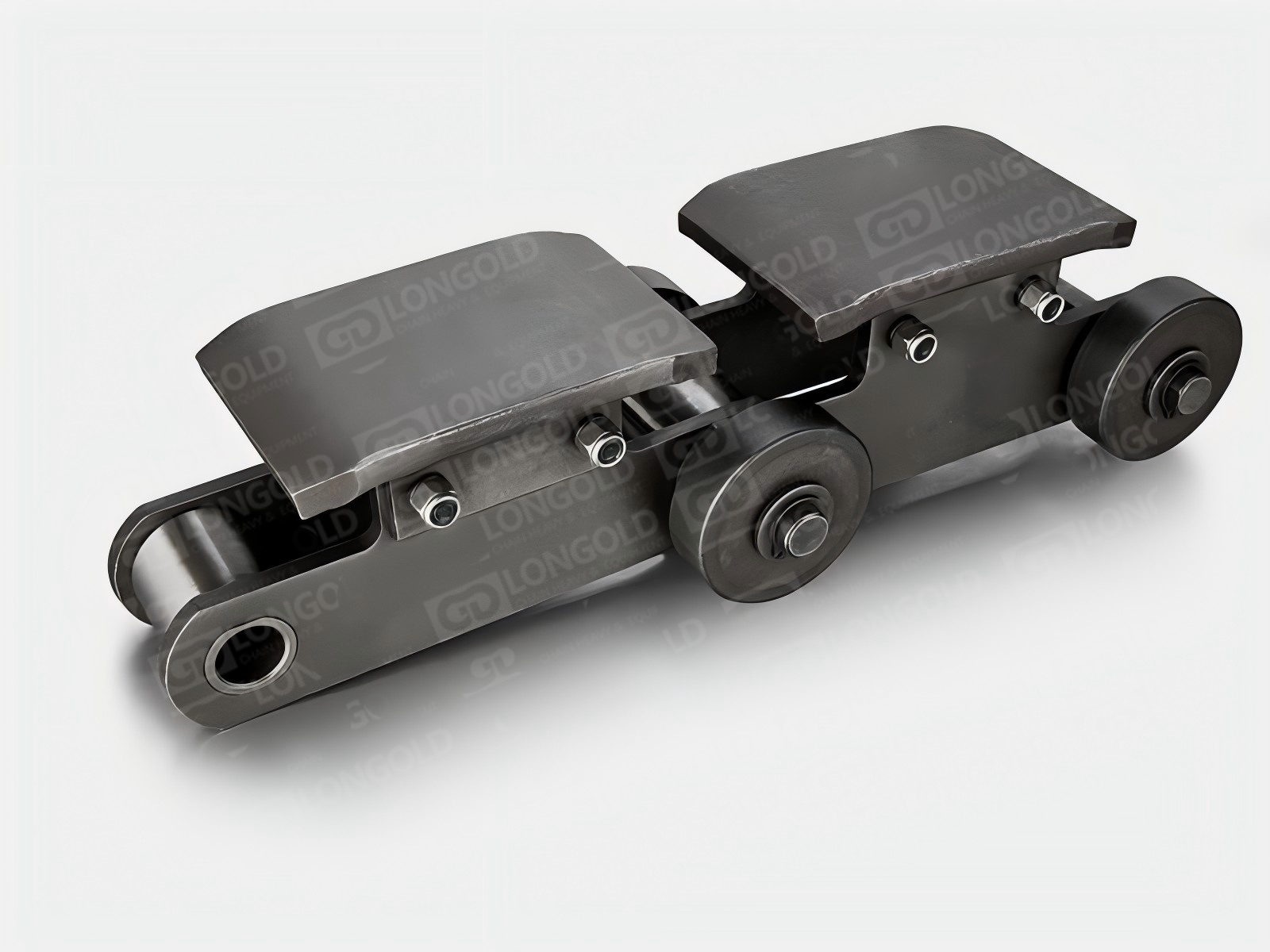 依靠鏈板底部底座附帶的折彎板上的孔將鏈條固定,能防止鏈條在運(yùn)輸過程中出現(xiàn)抖動蛇形等情況,同時鏈板為直板型,方便鋼材的放置和運(yùn)輸。