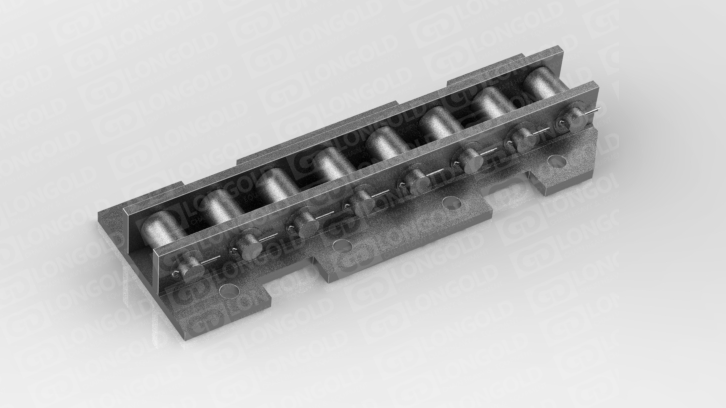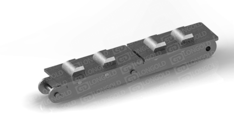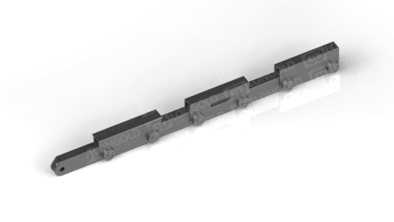 鏈條的頂板中間平,兩側(cè)則下彎,與相鄰頂板形成固定槽,這種結(jié)構(gòu)既可以用來輸送矩形鋼材,又能輸送柱狀鋼材,此外,鏈條兩側(cè)帶側(cè)置滾輪,可使鏈條的載重能力提升。