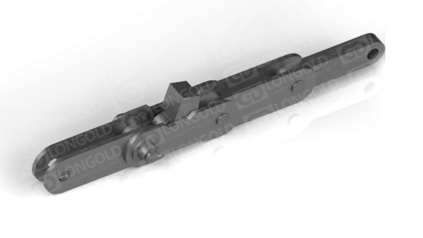 依靠鏈板底部底座附帶的折彎板上的孔將鏈條固定,能防止鏈條在運輸過程中出現(xiàn)抖動蛇形等情況,同時鏈板為直板型,方便鋼材的放置和運輸。
